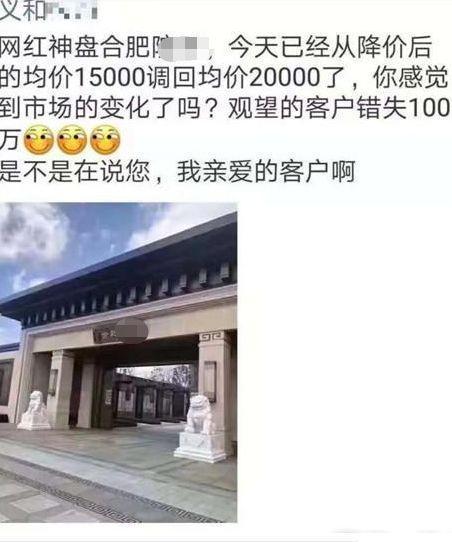 合肥一家楼盘被强制调价格,由原先的1.5万/㎡特惠价调到2万元/㎡,不少人感概瞬间错失100万。 据了解,合肥这家项目之前降价6000元/㎡,引起全国楼市一片哗然,更是引起相关部门关注, 在合肥房产局调研后, 合肥这家项目被曝恢复2万/㎡的售价 !